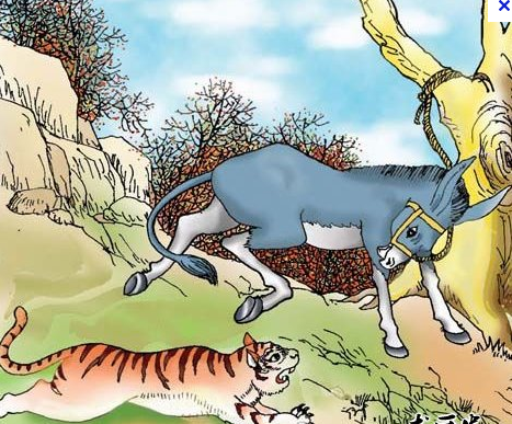 La source: D’après une fable de Liu Zongyuan(柳宗元773_819),homme de lettres des Tang,dans la province du Guizhou(贵州),il n’y avait jamais eu d’ânes ; quelqu’un en amena un pour le faire paitre au pied d’une montagne.Un tigre vint à passer ,aperçut cet animal énorme et l’entendit braire,il fut pris d’une grande peur. Peu après ,le tigre s’approcha lentement de l’âne pour le toucher. Furieux,ce dernier lui lança une ruade. Mais ,bientôt le tigre découvrit la vanité de sa ruade , il se jeta donc sur lui et le dévora à belles dents.